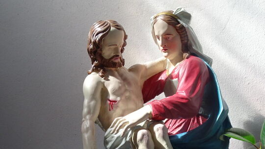 Hellenhahn-Schellenberg. Die katholische Kirche St. Petrus in Ketten in Hellenhahn-Schellenberg birgt ein Kleinod. Es handelt sich um eine Pietà (lateinisch für „Unsere Herrin vom Mitleid“), deren Alter nur geschätzt werden kann. Sie könnte nach fachlicher Beurteilung aus dem 18. Jahrhundert stammen. Eine Pietà ist in der Bildenden Kunst die Darstellung Marias als Mater Dolorosa (Schmerzensmutter) mit dem Leichnam des vom Kreuz abgenommenen Jesus Christus auf dem Schoß. Wann diese Skulptur in die Kirche kam, ist nicht mehr festzustellen. Sehr betagte Bürger aus dem Ort wissen mit Bestimmtheit, dass sich diese Skulptur vor dem letzten Kirchenneubau in den Jahren 1925/26 bereits im vormaligen alten Gotteshaus befand.
