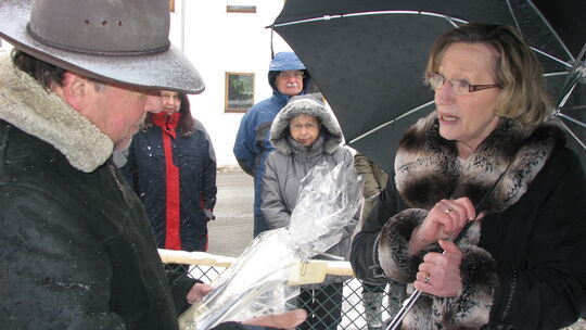 Die damalige Ortsbürgermeisterin Margret Flosdorf im Gespräch mit Gunter Demnig, der im Jahr 2013 einen Stolperstein in Holler verlegte. Archiv Thorsten Ferdinand. Thorsten Ferdinand