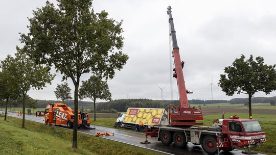 Wie die Polizei mitteilt, war ein Lkw am Freitag auf regennasser Fahrbahn nach rechts von der Fahrbahn abgerutscht und im Straßengraben gelandet. Aufgrund der Tiefe des Grabens war es dem Fahrer nicht möglich, den Lkw eigenständig aus dem Graben zu manövrieren.