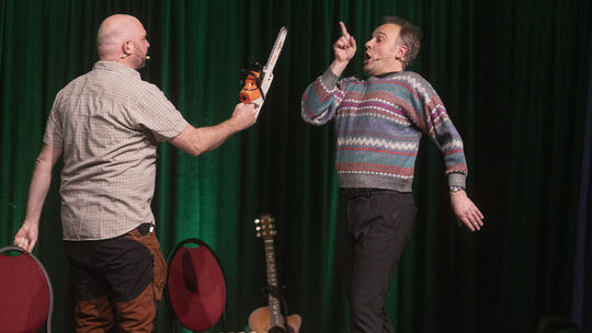 Streit am Jägerzaun: Nicht nur mit dieser Persiflage eines Ossi-Wessi-Konflikts unter Nachbarn begeisterten die beiden Kabarettisten Christian Miedreich (links) und René Sydow das Publikum in Hachenburg. Röder-Moldenhauer
