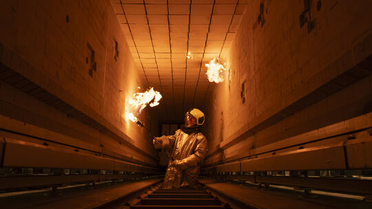 Aus dem Revisionsschacht tauchte der Mann mit der Fackel auf und zündete 2023 die Brenner des neuen Hochtemperaturofens bei Steuler. Einer dieser Öfen spart so viel Energie ein, wie 600 Haushalte verbrauchen. Archiv Jennifer Wolf Industriefotografie