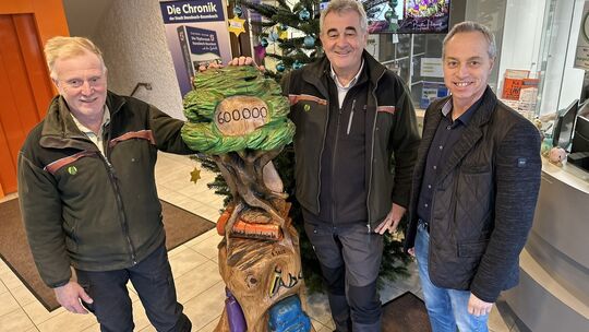 Eine imposante Holzskulptur von Motorsägenkünstler Andy Aßmann schmückt jetzt das Foyer des Rathauses in Ransbach-Baumbach. Sie ist ein Geschenk von Klimaschutzministerin Katrin Eder, die damit jüngst in Mainz die Stadt Ransbach-Baumbach, das Forstamt Neuhäusel und den langjährigen Förster Eckhard Niebisch für das jahrzehntelange Engagement in Sachen Umweltbildung geehrt hat.