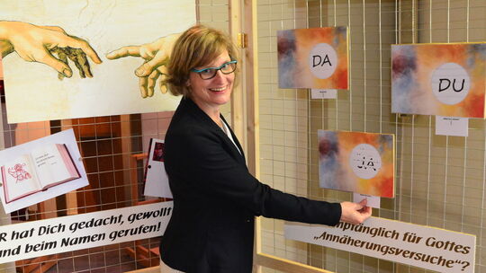 Bei den Themenwochen steht die interaktive Ausstellung „Mehr – Leben – Entdecken“ auf dem Programm. Hier mit Sonja Kirst (Projektleiterin von Haltung heute, oben) bei einem Ausstellungselement. WeG-Initiative
