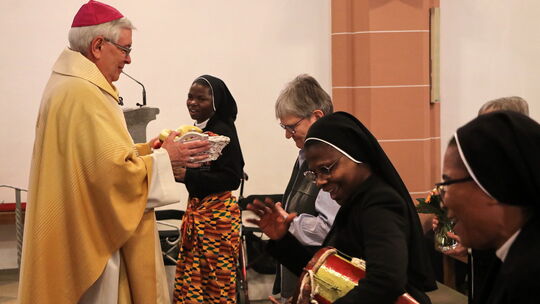 Weihbischof Thomas Löhr nimmt während der Eucharistiefeier zum Jubiläumsauftakt der Armen Dienstmägde Jesu Christi die Gaben zur Gabenbereitung entgegen. Hans-Peter Metternich