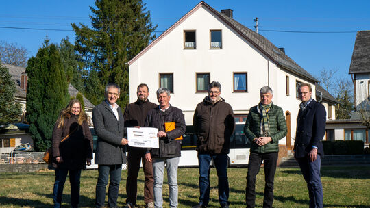 Abgeordneter Hendrik Hering (2. von links) überbrachte den Förderbescheid zur Freude von Jennifer Stahl (von links), Olaf Quirmbach (Ratsmitglieder), Ortsbürgermeister Helmut Lamp, Bauamtsleiter Michael Müller, VG-Bürgermeister Klaus Müller sowie des Ortsbeigeordneten Christian Fein. Foto: Abgeordnetenbüro Abgeordnetenbüro Hering