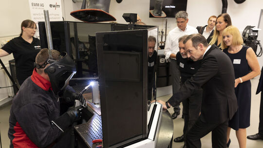 Bei seinem Rundgang durch das Unternehmen EWM in Mündersbach ließ sich der rheinland-pfälzische Wirtschaftsminister Volker Wissing (vorne rechts) neueste Schweißtechniken vorstellen.