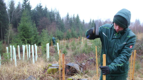 Andrej Kolkus schlägt im Selterser „Oberwald“ Stöcke neben den Eichensämlingen ein. Darüber werden die Schutzhüllen gesteckt (im Hintergrund zu sehen), die die Pflänzchen vor Verbiss schützen und zugleich ein günstiges Kleinklima bieten, welches das Wachstum fördert. Auf dem ehemaligen Fichtenstandort von rund 2,5 Hektar Fläche werden circa 1800 Sämlinge mit Vollschutz gesetzt. Katrin Maue-Klaeser