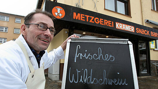 Metzgermeister Rainer Krämer wirbt vor seinem Laden in Höhr-Grenzhausen für seine neuen Produkte. Sein Geschäft wurde von einem randalierenden Keiler verwüstet. Foto: dpa