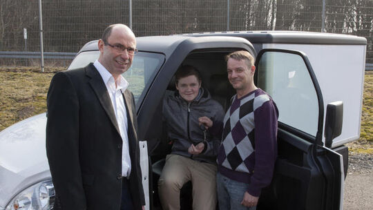 Firmenchef Jürgen Semmelmann, Azubi Johann Naumann und Fahrlehrer Christian Mohl sind von der Idee "16mobil" überzeugt. Foto: Steffi Wehr