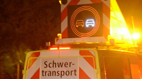 Derzeit werden 68 Meter lange Flügel für eine neue Windkraftanlage in der Gemarkung Salz mit einem ferngesteuerten Fahrzeug vom Zwischenlager an der B8 zum Windpark zwischen Weltersburg und Girkenroth transportiert. Zu nächtlicher Stunde sind die betroffenen Straßen temporär nicht passierbar. Markus Müller