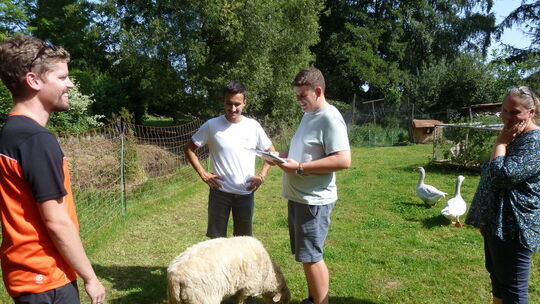 Im Garten von Sandra Broch-Weiss sind auch Schafe zugegen, als die Jury den Garten untersucht: (von links) Thomas Siry, Daniel Li Puma, Florian Stauber und Sandra Broch-Weiss. Joachim Kuchinke