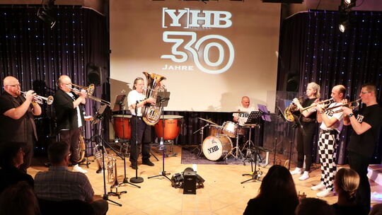 Das Blasensemble [Young] Harmonic Brass mit (von links) Oliver und Sven Krämer Wolfgang Hehl, Christian Wagner, Johanna Krämer, Timo Ramroth und Christian Eberz beim Konzert zum 30. Geburtstag im vergangenen Jahr. Hans-Peter Metternich