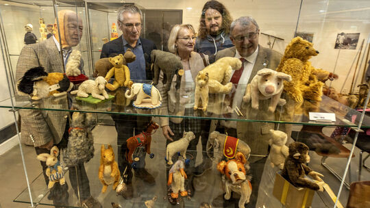 Auch die Ehrengäste der Eröffnungsfeier und Museumsleiter Dr. Manfrid Ehrenwerth (links) schwelgen angesichts der neuen Steiff-Ausstellung in Kindheitserinnerungen. Foto: Röder-Moldenhauer Röder-Moldenhauer