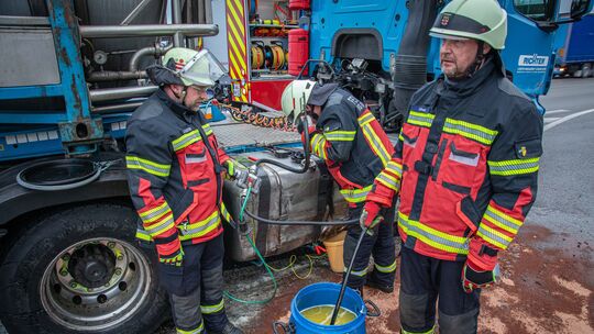 Ein aufgerissener Dieseltank eines Gefahrstoffzuges rief am Montagmorgen die Feuerwehr und Polizei auf den Plan. Unter anderem musste der beschädigte Tank abgepumpt werden. Andreas Egenolf