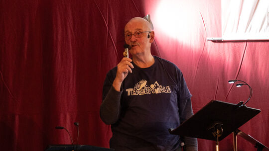 Gottfried Meyer stellt das Kazoo vor. Er verkündete seinen Abschied von der Männergruppe „Tersenväle“ aus Holler. Lena Bongard