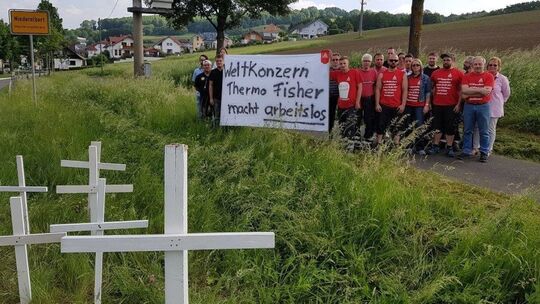 Niederelbert. Weiße Kreuze stieren den Autofahrern seit Mittwoch vom Ortseingang Niederelbert entgegen. Die Mitarbeiter des Unternehmens Thermo Fisher protestieren damit gegen die Schließung ihres Werks in Niederelbert und ziehen vor das Arbeitsgericht. Das Unternehmen will laut IG Metall die Niederlassung mit allen Mitteln zum 30. September schließen.