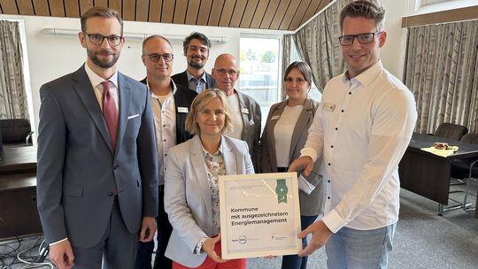 Die rheinland-pfälzische Umweltministerin Katrin Eder (Mitte) hat die Verbandsgemeinde Montabaur als erste "Kommune mit ausgezeichnetem Energiemanagement" geehrt. Bürgermeister Ulrich Richter-Hopprich (links) überließ die Auszeichnung dem Energieteam um Energiemanager Thilo Walet (von rechts), Michelle Najmula, Johannes Noll und Markus Felsing (2. von links). Gratulant war Alexander Kuhn von der Energieagentur (hinten). Katrin Maue-Klaeser