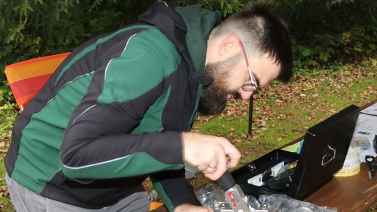 In Moschheim wurden eigens für das Wanderspektakel Buttons mit dem Vier-Dörfer-Tour-Logo gestanzt. Hans-Peter Metternich