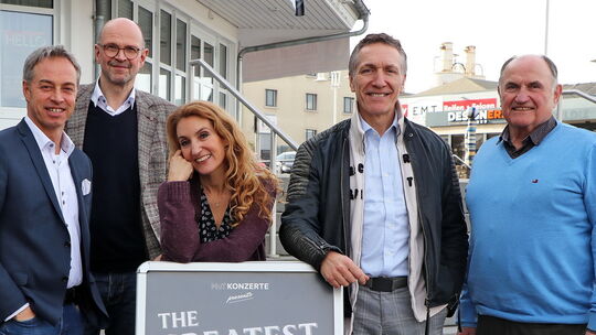 The Greatest Showduo mit Marion Wilmer (Mitte) und Nigel Casey (Zweiter von rechts), zwei Legenden der deutschen Musicalszene, gastiert am Freitag, 1. März, 19 Uhr, in der Stadthalle von Ransbach-Baumbach. Auf den Auftritt freuen sich (von links) Bürgermeister und Kulturkreis-Vorsitzender Michael Merz, Thomas Lubbers von der Agentur sowie der stellvertretende Kulturkreis-Vorsitzende Berthold Steudter. Hans-Peter Metternich