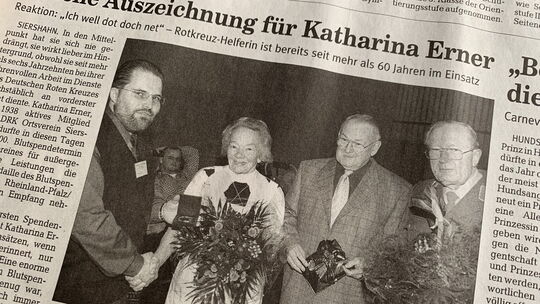 Beim 100. Blutspendetermin ihres Vereines wird Katharina Erner für außergewöhnliche Leistungen durch den Blutspendereferenten Jörg Backhaus (links) die Ehrenmedaille des Blutspendedienstes Rheinland-Pfalz/Saarland verliehen. Hans-Peter Metternich