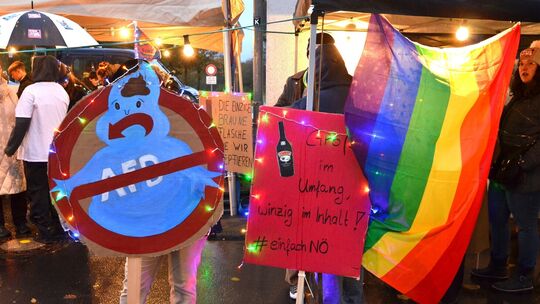 Vor der Götzenberghalle in Stockum-Püschen protestierten am 25. Oktober auch zahlreiche Mitglieder des Vereins Demos und weitere Menschen gegen eine Veranstaltung der ESN/AfD. Der Verein sieht sich immer wieder Anfeinungen gegenüber, erhält aber auch Rückhalt für seine Arbeit. Markus Müller