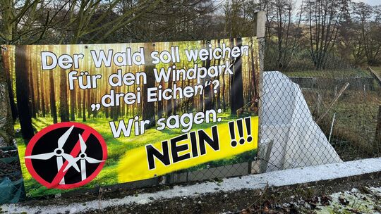 Gegner eines möglichen Windparks haben dieses Plakat in Quirnbach aufgehängt. Thorsten Ferdinand