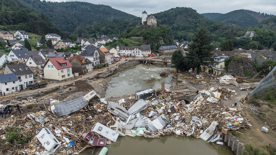 Anfang August sei ein internationales Forscherteam unter Koordinierung des DWD zu dem Ergebnis gekommen, dass sich die Wahrscheinlichkeit solcher Katastrophen durch den Klimawandel um den Faktor 1,2 bis 9 erhöht habe, sagte Fuchs. Die Intensität der Niederschläge sei in den untersuchten Regionen um 3 bis 19 Prozent gestiegen. Das Team hatte Frankreich, Westdeutschland, den östlichen Teil von Belgien, die Niederlande, Luxemburg und den Norden der Schweiz betrachtet. „Wir sehen also, der Klimawandel hatte seine Finger bei den Starkniederschlägen in diesem Jahr im Spiel“, sagte der Meteorologe.