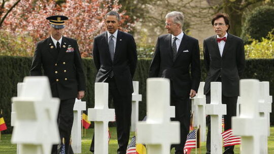 Stilles Gedenken an die im Ersten Weltkrieg gefallenen US-Soldaten: US-Präsident Barack Obama (2. von links), der belgische König Philippe (2. von rechts) und Premierminister Elio Di Rupo (rechts) erinnern im belgischen Waregem gemeinsam an das große Sterben. Foto: dpa