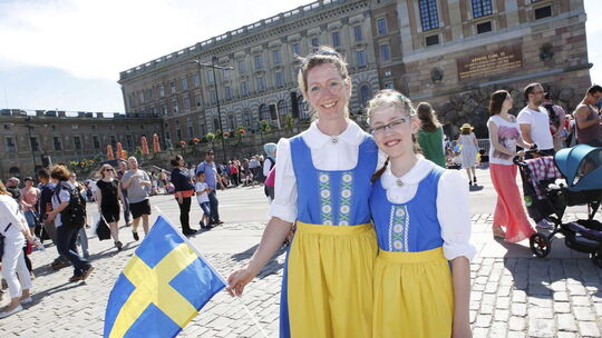 Unter die Zaungäste mit kleinen Flaggen in blau und gelb mischen sich am Samstag auch viele Deutsche wie Christine Bernhard und ihre Tochter Charlotte. Trotz des stundenlangen Wartens sind die beiden, die wie Königin Silvia aus Heidelberg stammen, begeistert vom Prinzenpaar und der Königsfamilie. «Wir sollten auch in Deutschland einen König haben», findet die zehnjährige Charlotte. «Das ist die Kindermeinung», entgegnet ihre Mutter schmunzelnd.