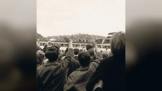 Königin Elizabeth II. von Großbritannien zu Besuch in Rheinland-Pfalz. Menschen winken in Koblenz dem Königspaar, das sich an Bord des KD-Schiffes "Loreley" gegeben hat. Foto: Leserzusendung Jürgen Schmidt
