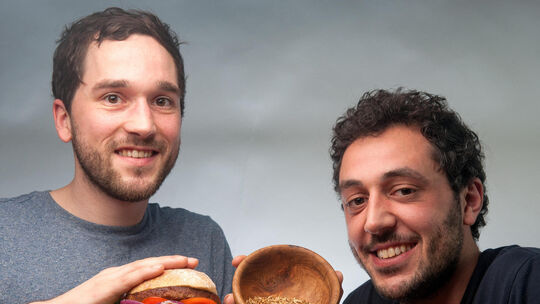 Max Krämer (links) und Baris Özel stellen ihren "Insekten-Burger" vor. Das Burgerfleisch besteht zu rund fünfzig Prozent aus Buffalo-Würmern (Getreideschimmelkäferlarven). Die Besonderheit zu anderen Insektengerichten besteht darin, dass dem Burger nicht anzusehen ist, aus welchem Fleisch er hergestellt wurde. Foto: Ingo Wagner/dpa