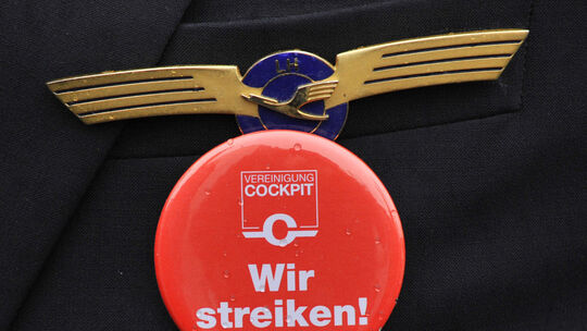 Einen roten "Wir Streiken!"-Button trägt dieser Lufthansa-Pilot am 22.02.2010 am Flughafen in Frankfurt am Main während einer Protestkundgebung. Die Lufthansa-Piloten wollen am 05.09.2014 streiken.