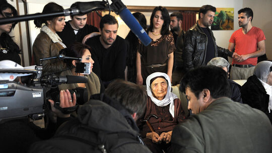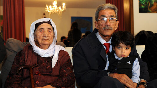 Umringt von Verwandten - und Kameras: Sabria Khalaf (107) ist jetzt bei ihrer Familie in Deutschland. Foto: dpa