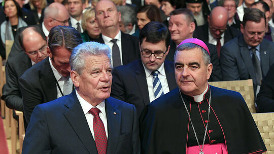 Altbundespräsident Joachim Gauck und Nikola Eterovic, Kurienerzbischof der römisch-katholischen Kirche und Diplomat des Heiligen Stuhls in der Schlosskirche zu Wittenberg.