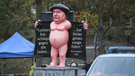 Eine Figur der Giordano- Bruno- Stiftung die einen nackten Luther darstellen soll der in seinem Mantel den Schriftzug „Luthers Ratschläge gegen die Juden … hat Hitler genau ausgeführt.“ trägt, steht unweit der Schlosskirche zu Wittenberg.