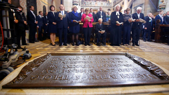 Gemeinsam mit dem obersten deutschen Katholiken Reinhard Marx übergibt Bedford-Strohm im Festgottesdienst ein Kreuz an Bundespräsident Steinmeier. Es sei das Versprechen, sich als Christen einzubringen in die Gesellschaft und mitzuhelfen, dass Friede, Versöhnung und Gerechtigkeit da seien, sagt Marx.