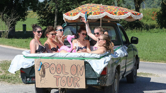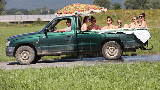 „Das ist eine gute Abkühlung“, schwärmt die 19-jährige Anna aus Unlingen. Auch Badeschaum und -salz seien dabei. Spaziergänger und Radler fänden das fahrbare Wasserbecken cool und freuten sich über kühlende Spritzer. Einziger männlicher Teilnehmer der Landpartie ist der Fahrer, der hinter dem Lenkrad schwitzt.