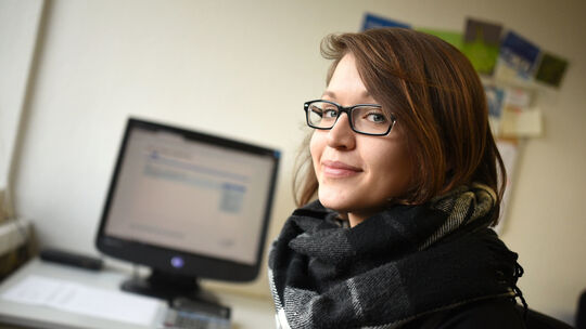 Julia Hinke, ehrenamtliche Betreuerin des des Trauer-Chats für Jugendliche sitzt an einem Computer.
