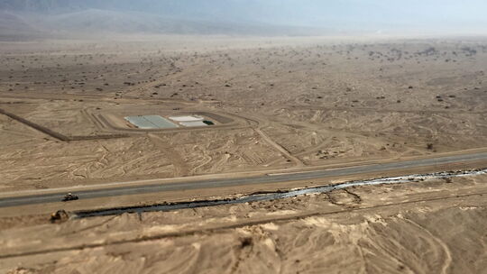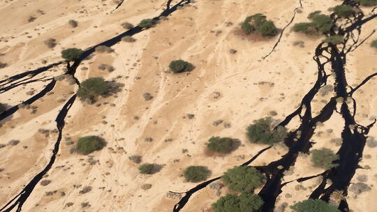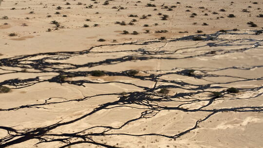 Die Luftaufnahme zeigt schwarze Ölbäche, die die Wüstenlandschaft nahe des Dorfes Beer Ora unweit der Großstadt Eilat durchziehen.