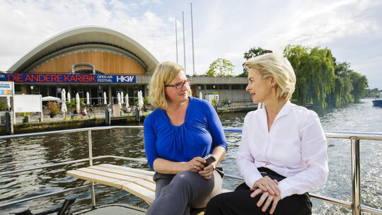 Unsere Berliner Korrespondentin Eva Quadbeck (links) hat Verteidigungsministerin von der Leyen auf der Barkasse "Marine 1" interviewt.