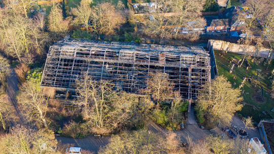 Das Drama von oben: Das Affenhaus im Krefelder Zoo ist nahezu komplett abgebrannt und muss abgerissen werden. Foto: dpa
