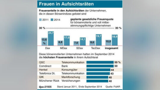 Nach Angaben des Vereins „Frauen in die Aufsichtsräte“ (Fidar) waren Ende September von 1669 Aufsichtsratsmitgliedern börsennotierter deutscher Unternehmen 316 weiblich. Das entspricht einer Quote von knapp 19 Prozent. Demnach erfüllten 27 Unternehmen die Quote, darunter Großkonzerne wie die Deutsche Bank, Henkel, Münchener Rück, Lufthansa, Deutsche Post, Deutsche Telekom, Allianz, Adidas und Commerzbank.