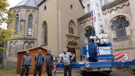Am Dach der Remagener Kirche St. Peter und Paul wird gearbeitet. Das Gebälk braucht dringend eine Generalüberholung, war es doch über die Jahre in Mitleidenschaft gezogen worden. Nun steht ein Kran im Innenhof der Kirche.