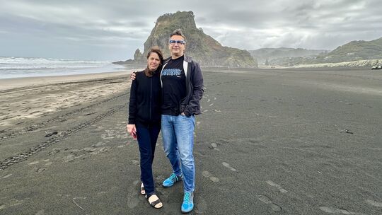 Ein Hunsrücker in Neuseeland: Hier posiert Dirk Weishaupt mit seiner Lebensgefährtin Stephanie am Piha Beach, der auch bei Surfern sehr beliebt ist. Im Hintergrund ist der sogenannte Lion Rock zu sehen. Dirk Weishaupt/privat