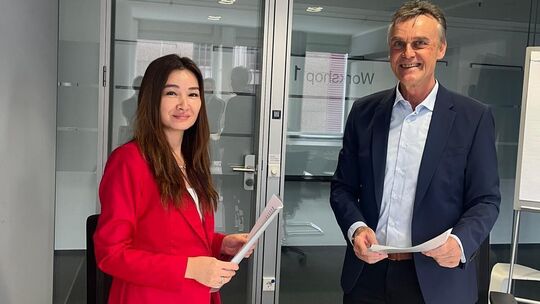 Meruyert Zholdybayeva, General Manager Aktau International Airport (links), und Rüdiger Franke, Geschäftsführer der Triwo Hahn Airport, nach der Unterzeichnung der Partnerschaft. Hamdi Guvenc/Aktau International Airport Joint Stock Company/Triwo Hahn Airport. Hamdi Guvenc/Triwo Hahn Airport