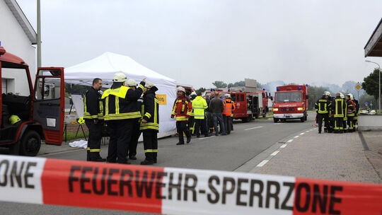 Rettungskräfte haben nach einer Gasexplosion auf dem Gelände einer Gasfirma in Harthausen bei Speyer eine Sperrzone eingerichtet. Auf dem Hof waren in der Nacht zwei Lastwagen in Brand geraten. Als die Flammen dann auf Gastanks übergriffen, kam es zur Explosion.