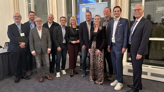Das Präsidium der Industrie- und Handelskammer Koblenz mit Markus Klingspor (Mitglied der Geschäftsleitung der Medialine Group) und Martin Hörhammer (Vorstand der Medialine Group), von links: Matthias Ess, Thomas Bellersheim, Wolfgang Küster, Rolf Löhmar, Hans-Jörg Platz, IHK-Präsidentin Susanne Szczesny-Oßing, Jörg Schäfer, Maren Hassel-Kirsche, Markus Klingspor und Martin Hörhammer (beide Medialine Group), IHK-Hauptgeschäftsführer Arne Rössel. Kerstin Gehring/IHK Koblenz