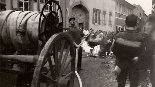Im Zuge der Pogromnacht wütete der braune Mobb am 10. November 1938 auch in Ockenheim (Kreis Mainz-Bingen). Unter den Augen zahlreicher Schaulustiger wurden dort unter anderem die Möbel jüdischer Einwohner auf offener Straße verbrannt. Pfarrarchiv Ockenheim
