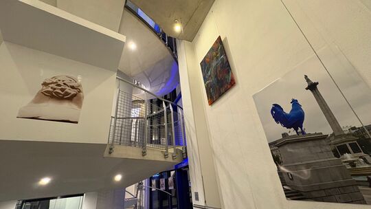 Neu gedacht und inszeniert werden soll das Theater Lahnstein im Zuge der aktuellen Ausstellung des Neuen Kunstvereins Mittelrhein. Darin zu sehen ist neben Arbeiten von Anne-Louise Hoffmann (links) und Michaela Tkadleček (Mitte) auch ein Foto des blauen Hahns von Katharina Fritsch. Elmar Hermann