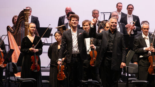 Applaus für den Pianisten Alexander Krichel (Mitte links) und den Dirigenten Dirk Kaftan beim Koblenzer Gastspiel des Beethoven Orchesters Bonn. Arek Głębocki